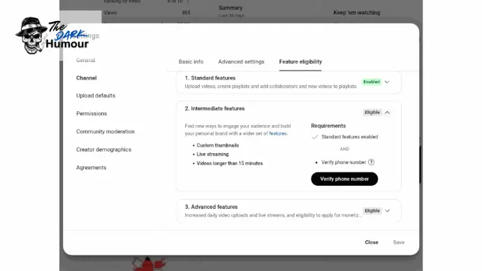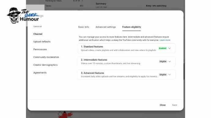 3. चैनल टैब पर क्लिक करें, फिर फीचर पात्रता चुनें ।