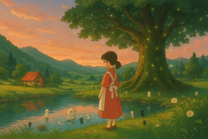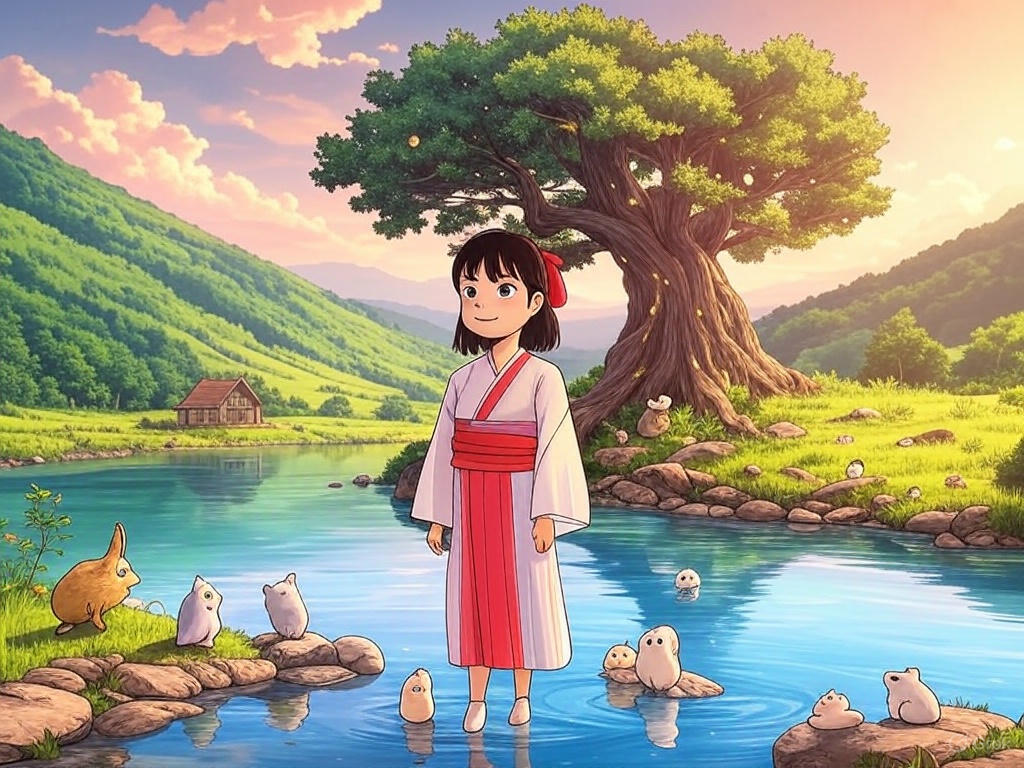 "A magical countryside scene in Studio Ghibli style, featuring a lush green valley with rolling hills, a small cozy wooden house with a red roof, and a giant ancient tree with glowing fireflies around it. A young girl in a traditional Japanese dress stands near a crystal-clear lake, watching friendly spirits and tiny whimsical creatures play around her. The sky is painted in soft pastel hues of pink and orange, with fluffy clouds drifting peacefully. The art style is hand-drawn, rich in warm colors, and filled with intricate details, evoking a sense of nostalgia, wonder, and tranquility."