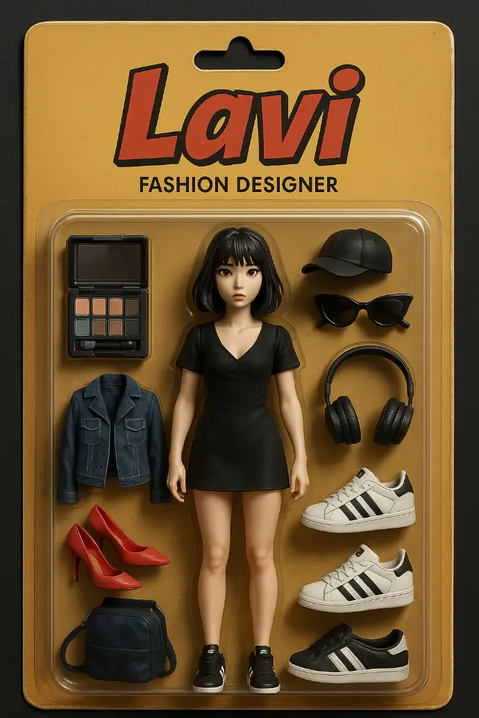 “Generate an action figure of a girl named Lavi, in modern fashion outfit with accessories like makeup kit, sunglasses, and heels.”